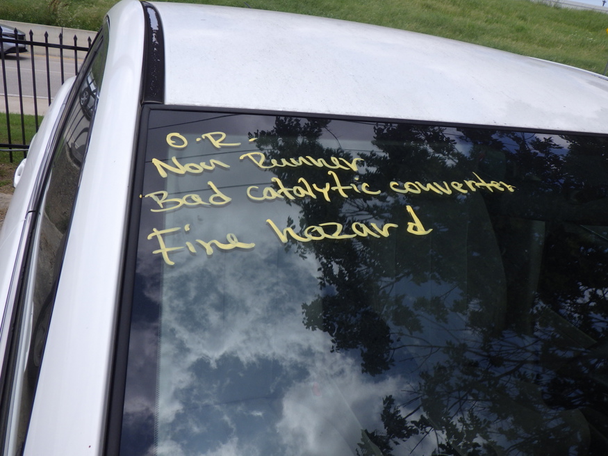 NO INSPECTION; NON RUNNER, BAD CATALYTIC CONVERTER, FIRE HAZARD